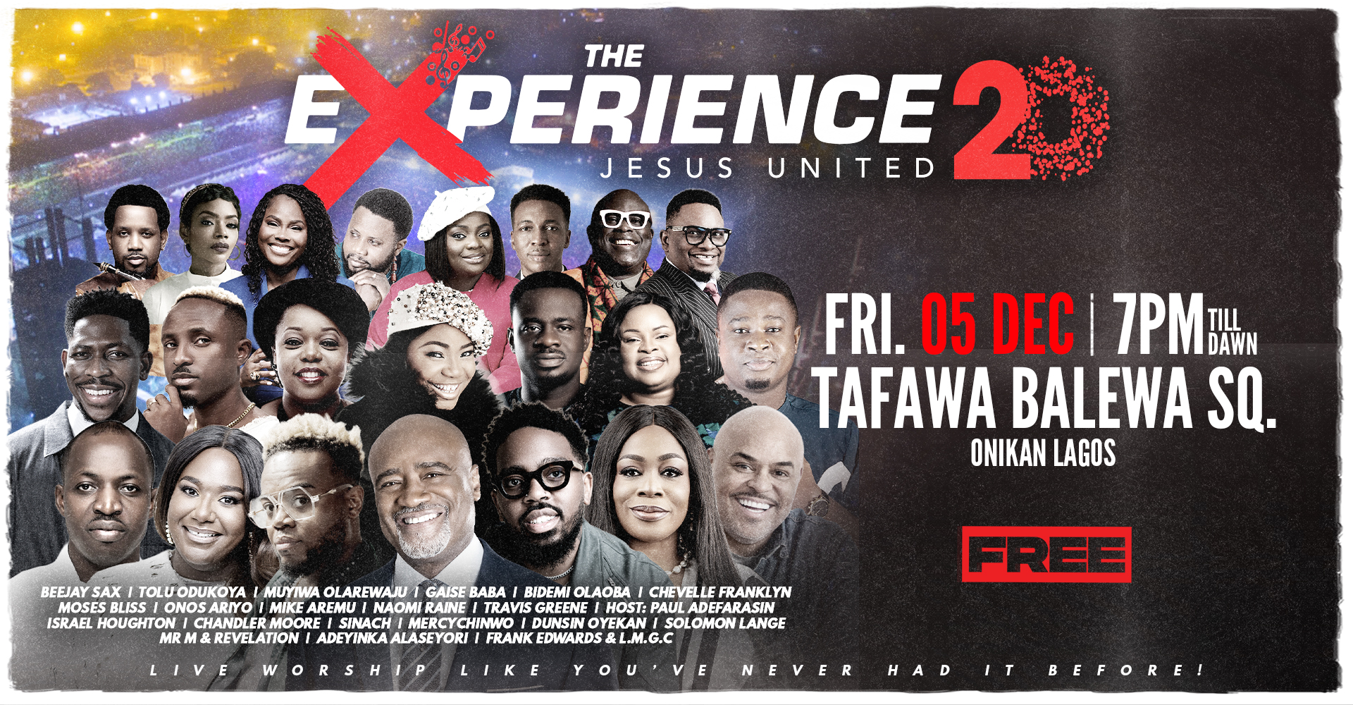 ‘The Experience’ is a free, all-night Gospel music concert featuring some of the most celebrated and exceptional psalmists from Nigeria and around the world. This phenomenal concert is convened annually by Pastor Paul Adefarasin, the Metropolitan of all House On The Rock, Lagos, Nigeria. Birthed by a God-inspired vision, ‘The Experience’ provides a platform where all can raise their hearts, hands and voices together as one in unfettered praise to the Almighty irrespective of tribe, denomination, creed or language.