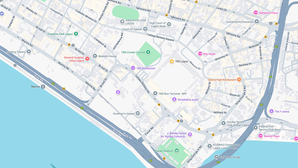 From Eko bridge, take the exit to Marina and follow the road signs to TBS.
